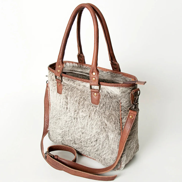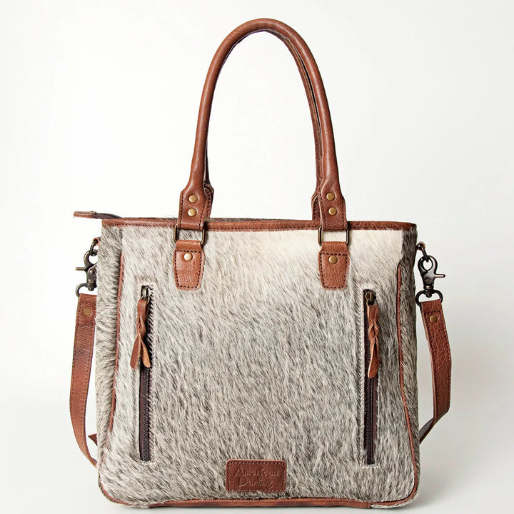 The American Darling Hair-On Cowhide Leather Western Tote Bag, Style No. LC-ADBG201, is a statement piece that embodies rugged elegance and artisan craftsmanship.