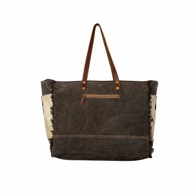 - This spacious bag features great design and utility all in one. A scalloped top panel of hand-tooled leather in warm caramel compliments the beautiful hair-on hide. The interior features a zippered pocket and zipper close top. Convenient pockets on each end offer convenience. The back is smoky charcoal woven canvas with frayed-edges treatment and separate zippered pocket. Matching durable leather carrying straps.